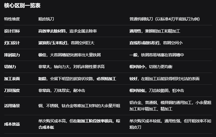 简单来说,粗皮铣刀是专门为高效粗加工设计的“大力士”,而普通钨钢铣刀更像是一个“多面手”,兼顾粗精加工,但效率不如前者。